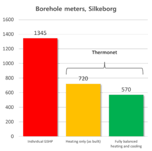 The solution reduces the need for relatively expensive vertical boreholes – rather than one borehole per house, with a total depth of 1,345 metres, fewer boreholes are needed with a total depth of 720 metres – by enabling them to be shared between houses via the thermal network.
